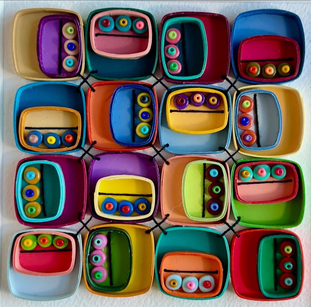 Sally Brandl is inspired by the traditional fiber arts of quilting, weaving, knitting, and embroidery. She has worked many years designing for the needlework industry and have always loved creating with fibers or paint. Sally began experimenting with combining the two and thoroughly enjoy creating these works. She has an unrestrained love of color and the joy it brings. Each painting begins with shapes and layers of transparent watercolor and no real plan, as she likes to let the painting evolve as she work. During the final phase of the piece, she sews a combination of threads, beads and quilling paper onto the paper to give energy and life to the patterns and shapes.
