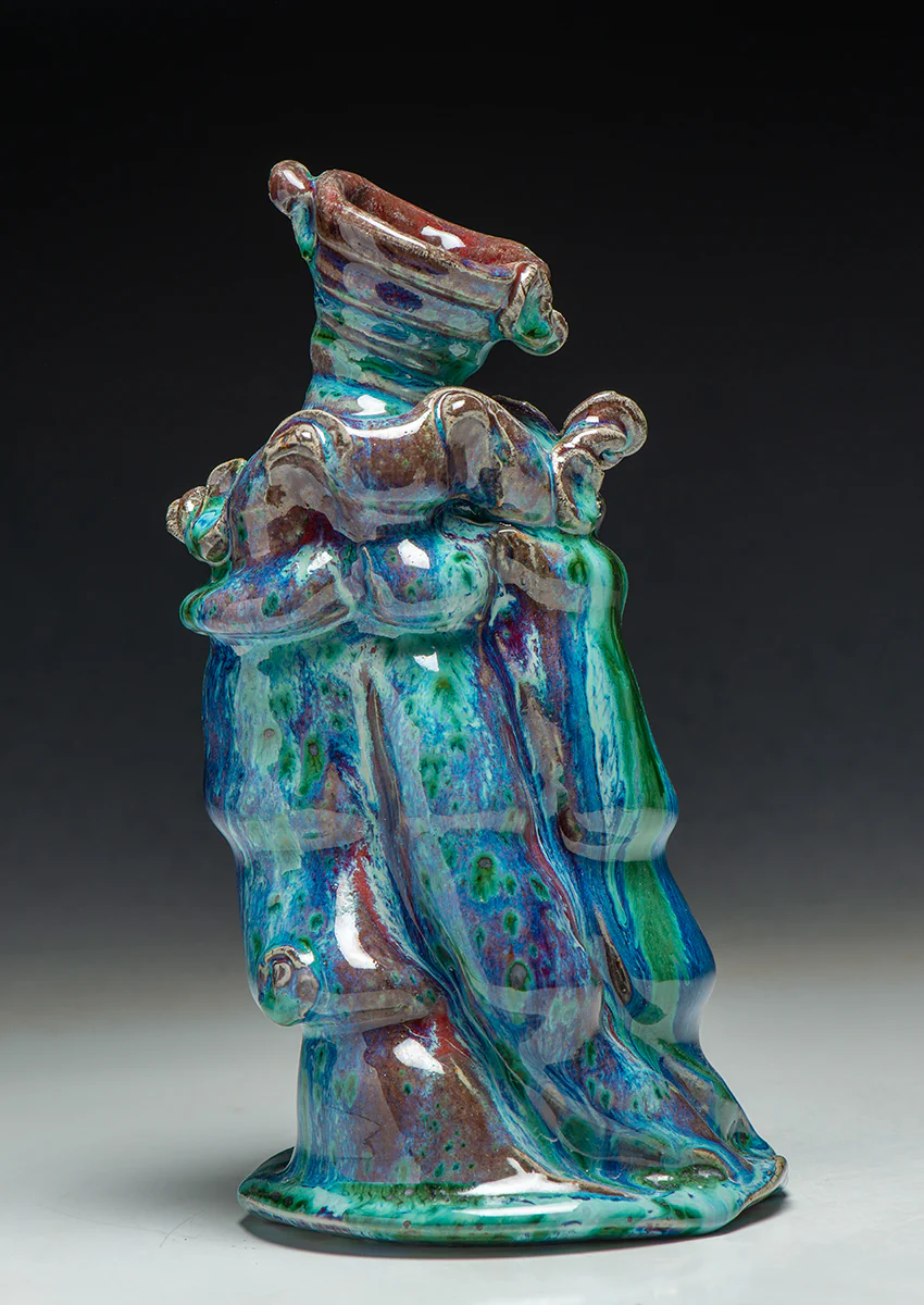 Since 2010 he has worked ‘solo’ in his home studio in Goshen, Indiana. His work has focused on a variety of pursuits: production pottery, and exhibition/museum-quality work utilizing reduction-firing, raku-firing, saggar-firing, side-firing, wood-firing, and soda-firing. In the last two years he has been pursuing, what he calls, “Oni-Glazing”: where up to 10 glazes, stains, and slips are layered onto a single piece for a single reduction high-firing. It may be said that “experimentation and discovery are his central voice”.